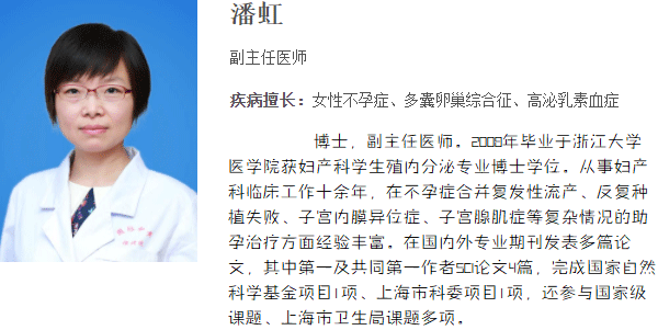 潘虹是中国福利会国际和平妇幼保健院辅助生殖科的副主任医师,2008年她从浙江大学医学院获得妇产科生殖内分泌专业的博士学位。她在妇产科临床工作已有十余年,尤其擅长处理不孕症伴复发性流产、反复种植失败、子宫内膜异位症及子宫腺肌症等复杂情况的助孕治疗。