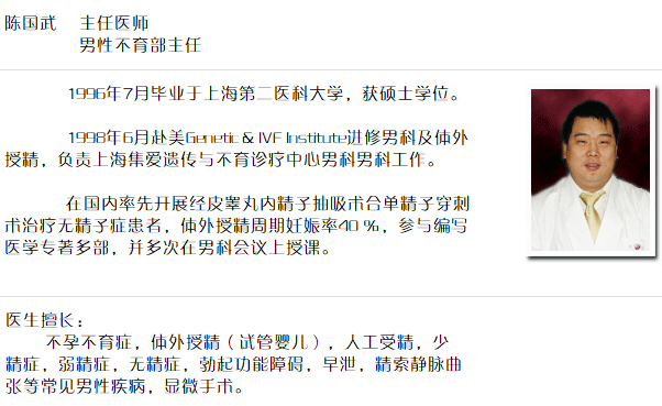 陈国武,复旦大学附属妇产科医院的主任医师,同时担任上海集爱遗传与不育诊疗中心的男性不育部主任。他于1996年7月从上海第二医科大学毕业,获得硕士学位。1998年6月,他前往美国的Genetic & IVF Institute深造,专攻男科和体外受精,负责上海集爱遗传与不育诊疗中心的男科相关工作。