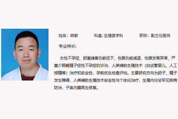 转黎,担任云南省第一人民医院生殖医学科副主任医师及讲师,拥有医学博士学位。他在美国哈佛大学医学院完成了博士后研究,并指导硕士生。此外,他是云南省生殖医学后备人才和云南省生殖遗传疾病临床医学中心的核心成员。