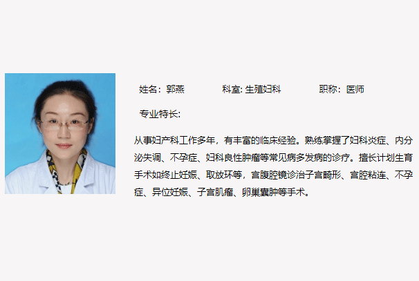 郭燕是云南省第一人民医院的生殖妇科住院医师,拥有硕士学位,同时也是云南省女医师协会计划生育分会的委员。她从事妇产科工作多年,积累了丰富的临床经验。