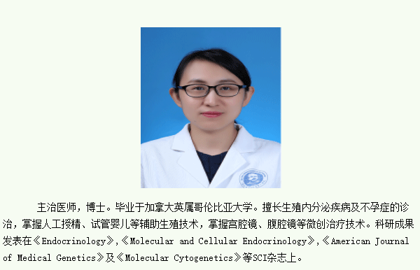 她精通人工授精和试管婴儿等辅助生殖技术,同时熟练掌握宫腔镜和腹腔镜等微创治疗技术。她的科研成果已在《内分泌学》、《分子与细胞内分泌学》、《美国医学遗传学杂志》和《分子细胞遗传学》等SCI期刊上发表。