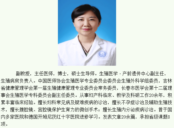 朱继红是吉林大学第一医院生殖医学中心的副主任医师和副教授,同时担任硕士生导师。她从事妇产科的临床、教学和科研工作已超过20年,积累了丰富的临床经验。