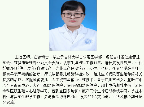 刘彦红是吉林大学第一医院生殖医学中心的主治医师,拥有硕士学位,毕业于吉林大学。她在生殖妇科领域工作了11年。