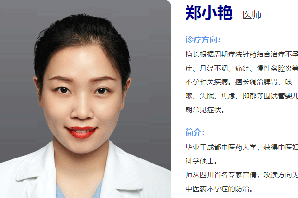 郑小艳是成都西囡妇科医院中医科的医生,毕业于成都中医药大学,并获得中医妇科学硕士学位。