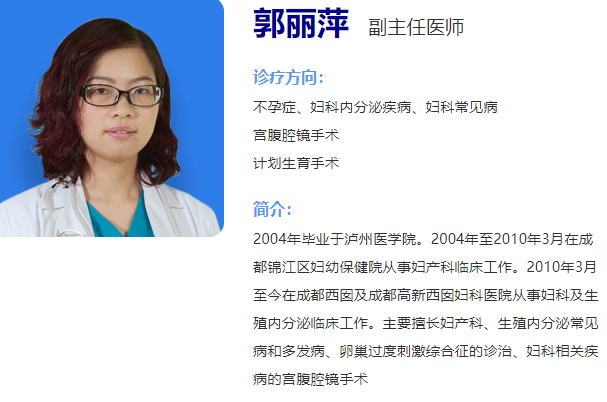 郭丽萍是成都西囡妇科医院的副主任医师,专注于妇科领域。她于2004年毕业于泸州医学院。随后,她在2004年至2010年3月期间,主要在成都锦江区妇幼保健院从事妇产科的临床工作。自2010年3月起,她在成都西囡和成都高新西囡妇科医院继续进行妇科及生殖内分泌方面的临床实践。