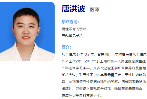 唐洪波是成都西囡妇科医院的男科医生,拥有超过10年的临床工作经验。他曾在四川大学附属医院从事临床外科工作两年,并于2017年前往上海市第一人民医院的泌尿生殖外科进行为期半年的进修学习。