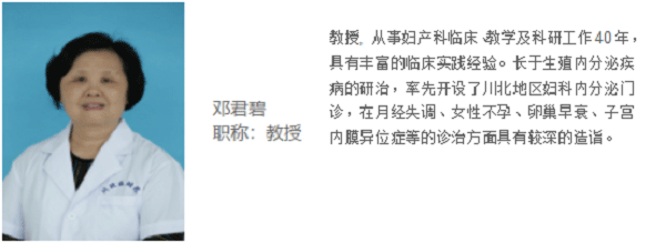 邓君碧教授是川北医学院附属医院生殖医学中心的专家,专注于妇产科的临床、教学和科研工作,已有40年的经验,积累了丰富的临床实践知识。