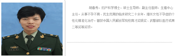 胡春秀是中国人民武装警察部队的成员。特色医疗中心生殖中心的副主任医师,副教授。
