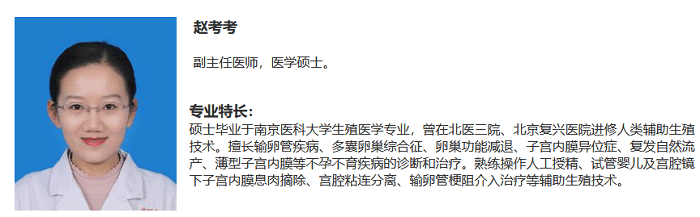 赵考考,现任济宁市第一人民医院生殖医学中心的副主任医师,拥有医学硕士学位。她在南京医科大学获得生殖医学专业硕士学位,并曾在北京大学第三医院与北京复兴医院进修人类辅助生殖技术。