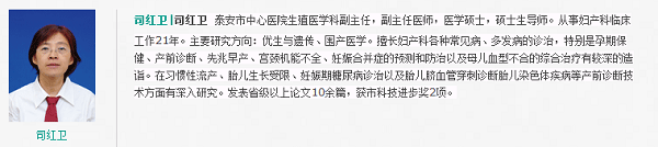 陶女士的评价:司红卫医生非常关心孕妇,十分和蔼,对她提问的问题总是耐心解答,让人感到亲切,是一位优秀的医生。我打算在产前检查时一直找她,希望司医生身体健康。