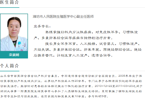 栾素娴,现任潍坊市人民医院生殖医学中心副主任医师,担任山东省中西医结合学会妇产科分会委员,并且是中国遗传学会遗传诊断分会的高级会员。她于2008年毕业于潍坊医学院,专业为妇产科生殖内分泌。
