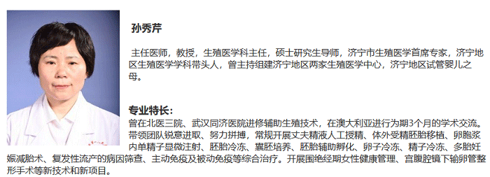 孙秀芹是济宁市第一人民医院生殖医学中心的主任医师。她于1987年毕业于青岛医学院临床医学专业,随后分别在山东省立医院、北京大学第三医院以及华中科技大学附属同济医院的生殖中心进行了进修。