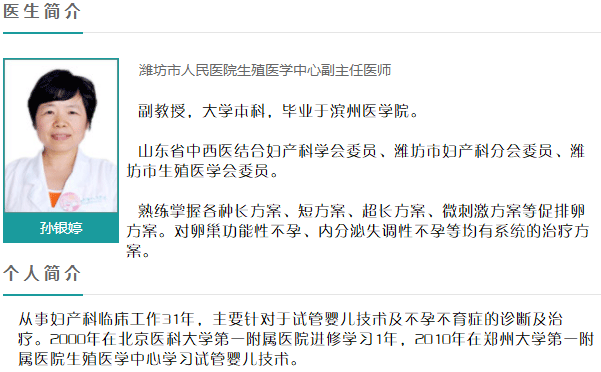 孙银婷是潍坊市人民医院生殖医学中心的副主任医师和副教授,具有本科学历,毕业于滨州医学院。她还担任山东省中西医结合妇产科学会委员、潍坊市妇产科分会委员以及潍坊市生殖医学会委员。