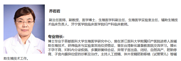 乔岩岩,济宁市第一人民医院生殖医学中心的副主任医师,拥有医学博士学位,担任副教授和副主任医师,同时也是生殖医学科的临床负责人。