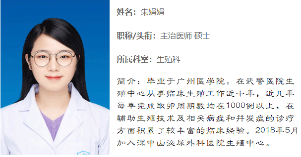 朱娟娟是深圳中山泌尿外科医院的生殖科主治医生,毕业于广州医学院。她在深圳武警医院生殖中心从事临床生殖工作近十年,近年来每年完成的取卵周期都超过1000例。