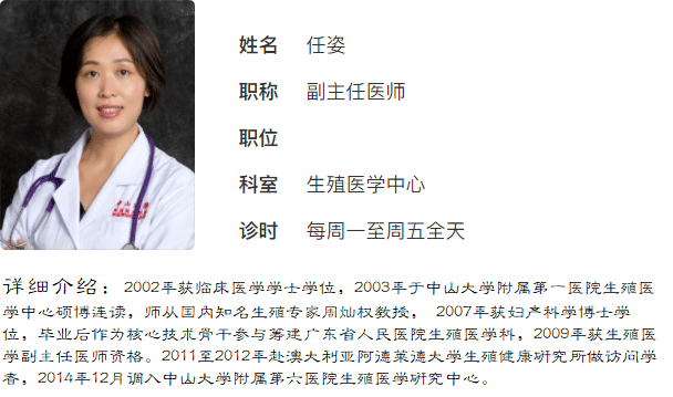 任姿是中山大学附属第六医院生殖医学中心的副主任医师,拥有医学博士学位。她于2002年获得临床医学学士学位,随后于2003年在中山大学附属第一医院生殖医学中心攻读硕士和博士学位,师从著名生殖医学专家周灿权教授。