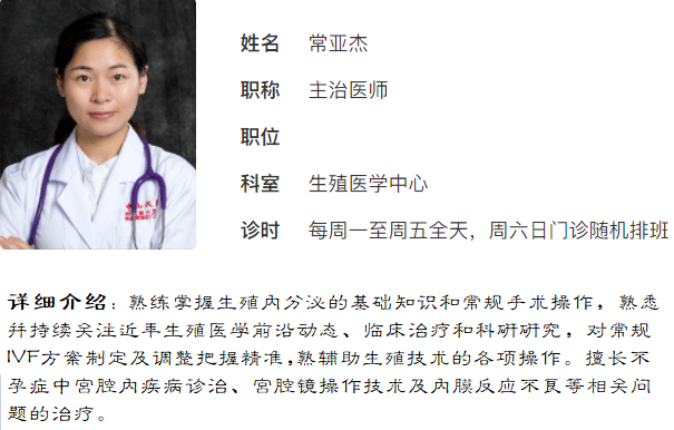 常亚杰,医学硕士,现为中山大学附属第六医院生殖医学中心的主治医师。她于2009年至2012年在中山大学附属第一医院生殖医学中心完成了系统的妇产科临床培训,之后加入中山大学附属第六医院生殖中心工作。
