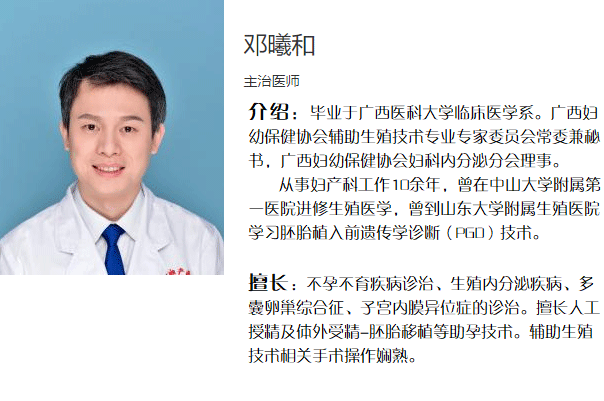 邓曦和是广西壮族自治区妇幼保健院生殖医学中心的主治医生,毕业于广西医科大学临床医学专业。她同时担任广西妇幼保健协会辅助生殖技术专业委员会的常务委员及秘书,并且是广西妇幼保健协会妇科内分泌分会的理事。