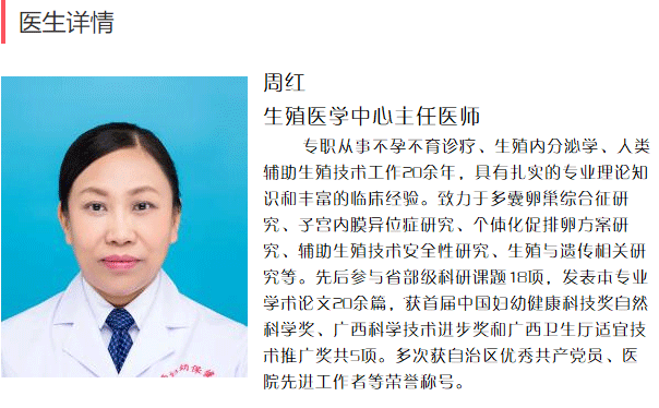 周红,广西壮族自治区妇幼保健院生殖医学中心的主任医师,拥有医学硕士学位,并担任该中心的主任。她目前还担任妇幼健康研究会生殖免疫学专业委员会常务委员,广西医学会生殖医学分会副主任委员,以及广西医师协会生殖医学专业委员会常务委员。此外,她还担任广西妇幼保健协会辅助生殖技术专业专家委员会主任委员和广西妇幼保健协会妇科内分泌分会常务委员。