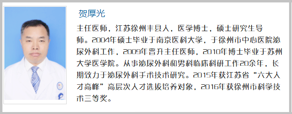 贺厚光,现任徐州市中心医院泌尿外科及生殖医学中心主任医师,教授,来自江苏徐州丰县,获得医学博士学位,同时担任硕士研究生导师。他于1991年本科毕业于徐州医学院(现在的徐州医科大学),之后在徐州矿务集团第二医院任职。2004年,他在南京医科大学获得硕士学位,随后回到徐州市中心医院泌尿外科工作,并于2009年晋升为主任医师。2010年,他在苏州大学医学院获得博士学位。