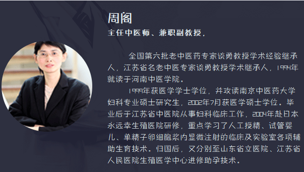 周阁是江苏省中医院生殖医学中心的副主任医师与主任中医师,兼任副教授。他是全国第六批老中医药专家谈勇教授学术经验的继承人,也是江苏省名老中医专家谈勇教授的学术传承者。此外,他还担任江苏省中西医结合生殖医学学会的秘书,并担任全国中西医结合生殖医学学会的青年委员,以及江苏省医学会妇产科分会内分泌学组的成员。