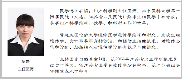 吴畏是江苏省妇幼保健院生殖医学科的副主任医师,正在攻读医学博士学位,同时担任妇产科学副主任医师。他是南京医科大学第一附属医院(即江苏省人民医院)临床生殖医学中心的专家,已有超过10年的妇产科学临床、教学和科研经验。