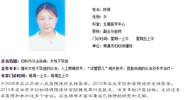 陈丽是南通市妇幼保健医院生殖医学中心的副主任医师,同时担任南通大学的兼职讲师,已有14年的生殖医学工作经验,积累了丰富的专业知识和实践经验。