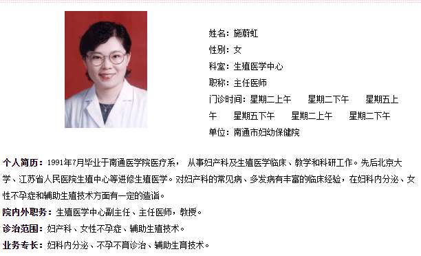 施蔚虹是南通市妇幼保健医院生殖医学中心的主任医师和教授,同时担任生殖医学中心的副主任。她于1991年7月毕业于南通医学院医疗系,从事妇产科和生殖医学的临床、教学及科研工作。她曾先后在北京大学和江苏省人民医院生殖中心进修生殖医学。