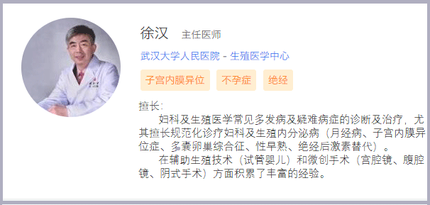 徐汉,现任武汉大学人民医院生殖医学中心的主任医师和副教授,生于1960年9月,拥有本科学历。